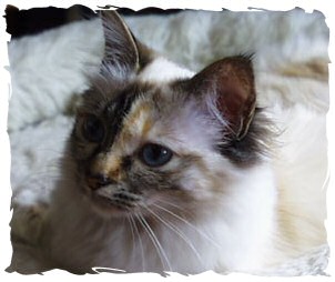 Sunny, unsere Süße, zart und winzig, gar nicht birmatypisch. Ein Traum in Bunt. Schnurrte am meisten von allen, war wendig und gewitzt beim Spiel, selbstbewusst und gerne in meiner Nähe (schlief dann neben dem Computer auf dem zweiten Bürostuhl oder oben im Hochbett und kam auch gern nachts zu mir). Wenn sie etwas wollte, sagte sie es =) Ihr Tick: sie drehte durch wenn man „Lichtpunktfangen“ mit ihr spielte ^^